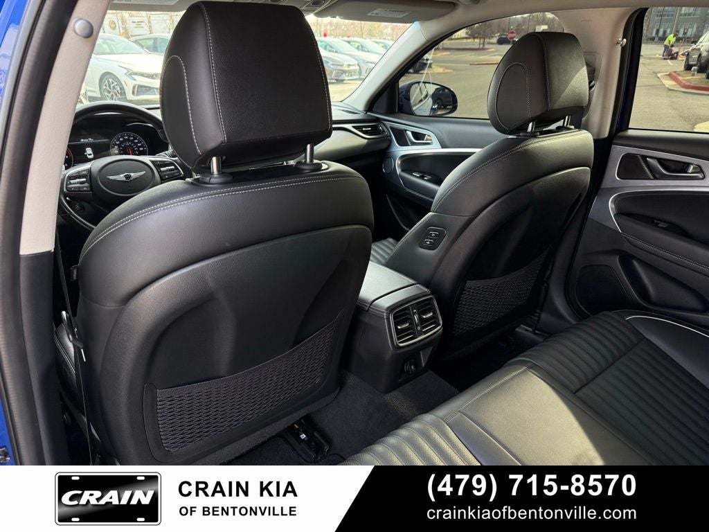 15 Speakers, 4-Wheel Disc Brakes, ABS brakes, Air Conditioning, Alloy wheels, AM/FM radio: SiriusXM, Android Auto & Apple CarPlay, Anti-whiplash front head restraints, Auto High-beam Headlights, Auto-dimming door mirrors, Auto-dimming Rear-View mirror, Automatic temperature control, Brake assist, Bumpers: body-color, Delay-off headlights, Driver door bin, Driver vanity mirror, Dual front impact airbags, Dual front side impact airbags, Electronic Stability Control, Emergency communication system: Genesis Connected Services, Exterior Parking Camera Rear, Four wheel independent suspension, Front anti-roll bar, Front Bucket Seats, Front Center Armrest, Front dual zone A/C, Front reading lights, Fully automatic headlights, Garage door transmitter: HomeLink, Heated & Ventilated Front Bucket Seats, Heated door mirrors, Heated front seats, Illuminated entry, Knee airbag, Leather Seat Trim, Low tire pressure warning, Memory seat, Navigation System, Occupant sensing airbag, Option Group 01, Outside temperature display, Overhead airbag, Overhead console, Panic alarm, Passenger door bin, Passenger vanity mirror, Power door mirrors, Power driver seat, Power passenger seat, Power steering, Power windows, Radio: AM/FM/HD Radio/SiriusXM Lexicon Audio, Rear anti-roll bar, Rear reading lights, Rear seat center armrest, Rear window defroster, Remote keyless entry, Security system, Speed control, Speed-Sensitive Wipers, Split folding rear seat, Steering wheel memory, Steering wheel mounted audio controls, Tachometer, Telescoping steering wheel, Tilt steering wheel, Traction control, Trip computer, Turn signal indicator mirrors, Variably intermittent wipers, Ventilated front seats.