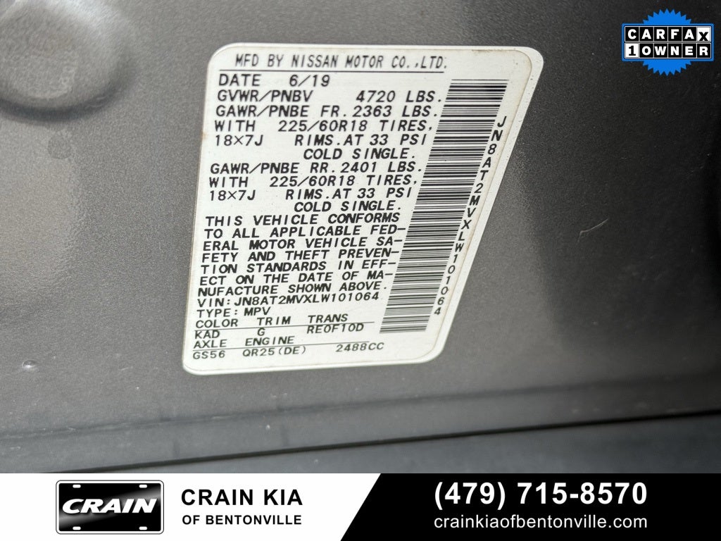 One Owner, AWD, 17 Aluminum Alloy Wheels, 18 Aluminum Alloy Wheels, 4-Wheel Disc Brakes, 6 Speakers, 6.386 Axle Ratio, ABS brakes, Air Conditioning, Alloy wheels, AM/FM radio: SiriusXM, Anti-whiplash front head restraints, Auto High-beam Headlights, Automatic temperature control, Black Splash Guards (Set of 4), Blind Spot Warning, Brake assist, Bumpers: body-color, CD player, Chrome Rear Bumper Protector, Cloth Seat Trim, Delay-off headlights, Driver door bin, Driver vanity mirror, Dual front impact airbags, Dual front side impact airbags, Electronic Parking Brake, Electronic Stability Control, First Aid Kit, Floor Mats & 2-PC Cargo Area Protector, Four wheel independent suspension, Frameless Rearview Mirror w/Universal Remote, Front anti-roll bar, Front Bucket Seats, Front Center Armrest w/Storage, Front dual zone A/C, Front reading lights, Fully automatic headlights, Heated door mirrors, Heated Front Bucket Seats, Heated front seats, Heated Leather-Wrapped Steering Wheel, Illuminated entry, Intelligent Aroundview Monitor (I-AVM), Intelligent Cruise Control, Lane Departure Warning System, Leather Shift Knob, Low tire pressure warning, Memory Driver Seat & Outside Mirrors, NissanConnect featuring Apple CarPlay and Android Auto, Occupant sensing airbag, Outside temperature display, Overhead airbag, Overhead console, Panic alarm, Passenger door bin, Passenger vanity mirror, Power door mirrors, Power driver seat, Power Liftgate, Power steering, Power windows, Premium Package, ProPILOT Assist, Radio data system, Radio: AM/FM/CD/AUX, Radio: AM/FM/CD/AUX NissanConnect w/Navigation, Rear anti-roll bar, Rear Parking Sensors, Rear seat center armrest, Rear window defroster, Rear window wiper, Remote keyless entry, Roof rack: rails only, Security system, Speed control, Speed-sensing steering, Split folding rear seat, Spoiler, Steering Assist, Steering wheel mounted audio controls, Tachometer, Telescoping steering wheel, Tilt steering wheel, Traction control, Trip computer, Turn signal indicator mirrors, Variably intermittent wipers.