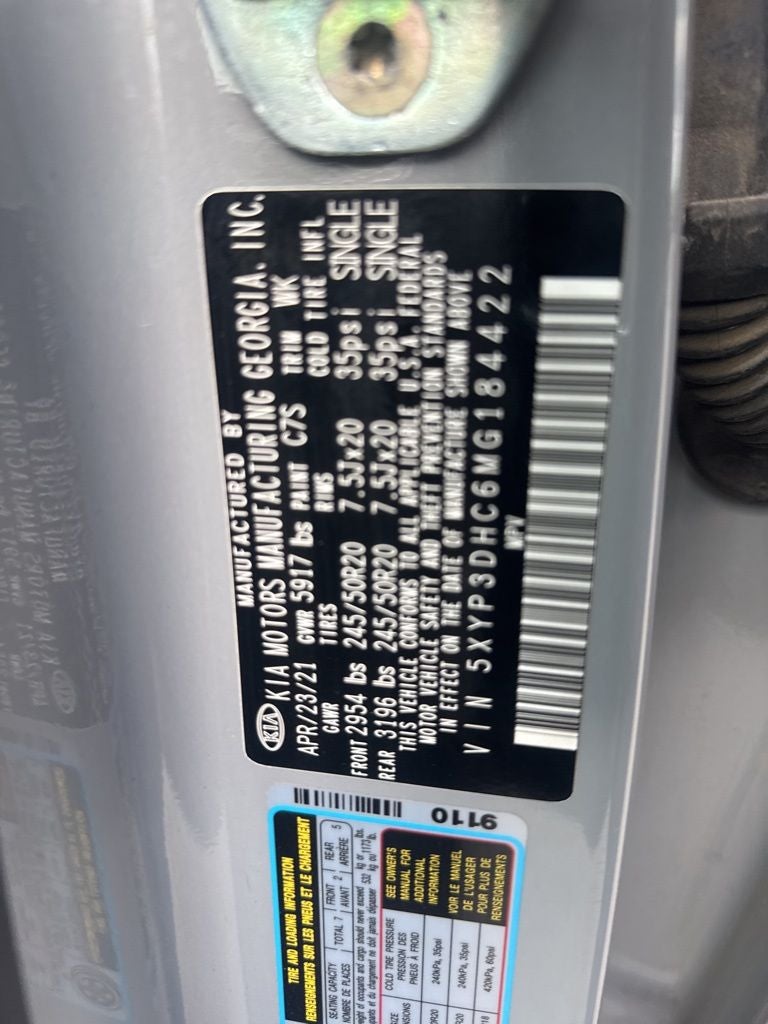 2nd Row Captain Chairs, 3.648 Axle Ratio, 3rd row seats: split-bench, 4-Wheel Disc Brakes, 6 Speakers, ABS brakes, Air Conditioning, Alloy wheels, AM/FM radio: SiriusXM, Apple CarPlay & Android Auto, Auto-dimming Rear-View mirror, Automatic temperature control, Black Finish Radiator Grille, Brake assist, Bumpers: body-color, Cargo Cover, Carpeted Floor Mats, Compass, Delay-off headlights, Driver door bin, Driver vanity mirror, Dual front impact airbags, Dual front side impact airbags, Electronic Stability Control, Emergency communication system: 911 Connect, EX Premium Package, Exclusive Black Headlight Bezels, Four wheel independent suspension, Front & Rear Gloss Black Finish Bumper Skid Plates, Front & Rear KIA Logo, Front anti-roll bar, Front Bucket Seats, Front Center Armrest, Front dual zone A/C, Front reading lights, Fully automatic headlights, Gloss Black Finish Exterior Emblems, Gloss Black Finish Front & Rear Door Garnish, Gloss Black Finish Roof Rails, Heated & Ventilated Front Bucket Seats, Heated door mirrors, Heated front seats, Heated steering wheel, Illuminated entry, Knee airbag, Leather Seat Trim, Leather Shift Knob, Leather steering wheel, LED Headlamps, Low tire pressure warning, Navigation System, Nightfall Edition Package, Occupant sensing airbag, Outside temperature display, Overhead airbag, Overhead console, Panic alarm, Passenger door bin, Passenger vanity mirror, Power door mirrors, Power driver seat, Power Liftgate, Power moonroof, Power passenger seat, Power steering, Power windows, Radio data system, Radio: AM/FM/SIRIUS Display Audio, Rear air conditioning, Rear anti-roll bar, Rear audio controls, Rear reading lights, Rear seat center armrest, Rear window defroster, Rear window wiper, Reclining 3rd row seat, Remote keyless entry, Roof rack: rails only, Satin Chrome Roof Rails, Security system, Self Leveling Rear Suspension, Smart Key w/ Push Button and Remote Start, Speed control, Speed-sensing steering, Split folding rear seat, Spoiler, Steering wheel mounted audio controls, Tachometer, Telescoping steering wheel, Tilt steering wheel, Tow Hitch w/Harness (TOF), Towing Package, Traction control, Trip computer, Turn signal indicator mirrors, Variably intermittent wipers, Ventilated front seats, Wheels: 7.5 x 18 Machined Finish Alloy, Wheels: 7.5 x 20 Exclusive Black Finish Alloy, Wheels: 7.5 x 20 Machined Finish Alloy.